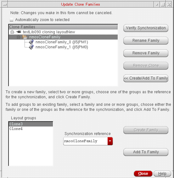 Use the Update Clone Families form to manage the families of synchronized clones in your design. You can update the status of a clone family, rename a clone family, remove a clone from a family, create and remove clone families, and add a group to an existing family.