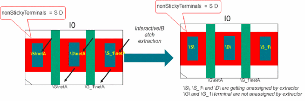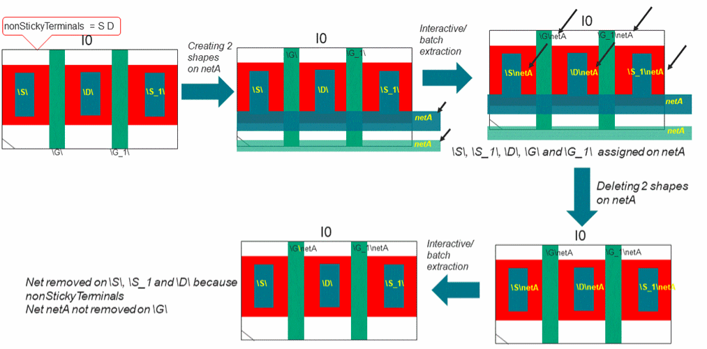 In the following example with nonStickyTerminals S and D, two shapes are created on netA. After interactive or batch extraction, S, S_1, D, G, and G_1 are assigned on netA. If the shapes are deleted from netA, then after interactive or batch extraction, the net is removed from S, S_1, and D but not from G.