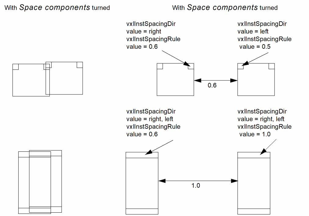 If the vxlInstSpacingRule Property value is different for two pins affected by Space components, the larger of the two values is used; if the value is defined for only one of two pins affected by Space components, the defined value is used.