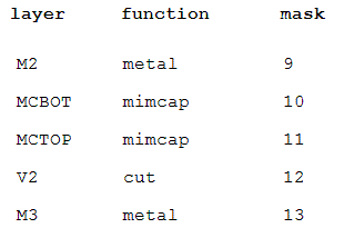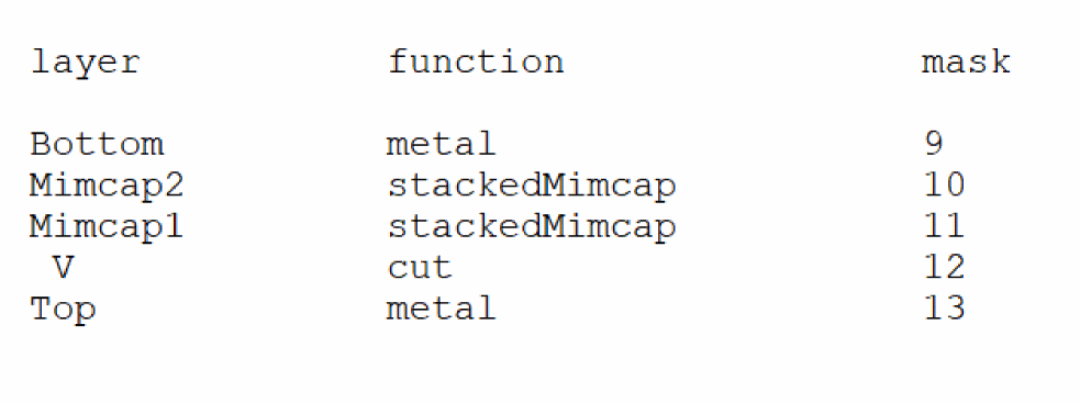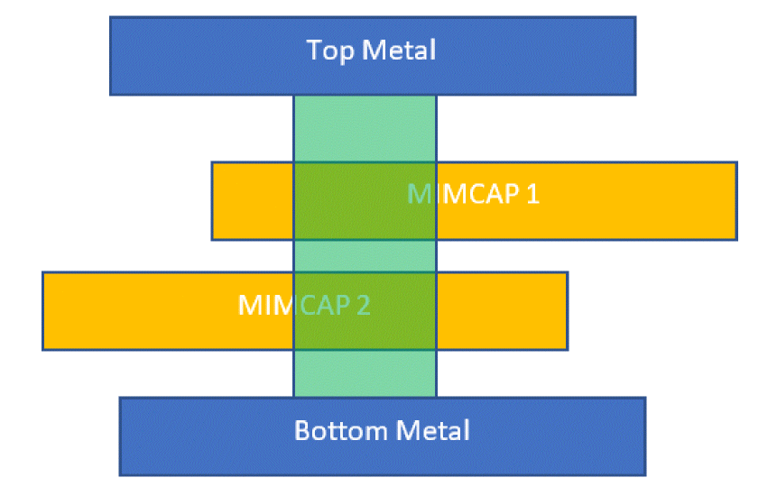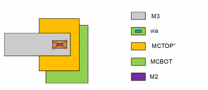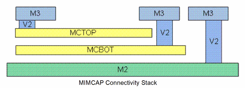 The figure below represents a MIMCAP connectivity stack. Here, the cut layer, V2, connects the metal layer, M3, to another metal layer, M2, which has a lower mask number. In addition, the cut layer connects the top metal layer to intermediate metal layers, MCTOP and MCBOT.