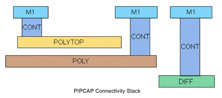 The figure below represents a PIPCAP connectivity stack. Here, the cut layer, CONT, connects the metal layer, M1, to two poly layers, POLYTOP and POLY.