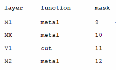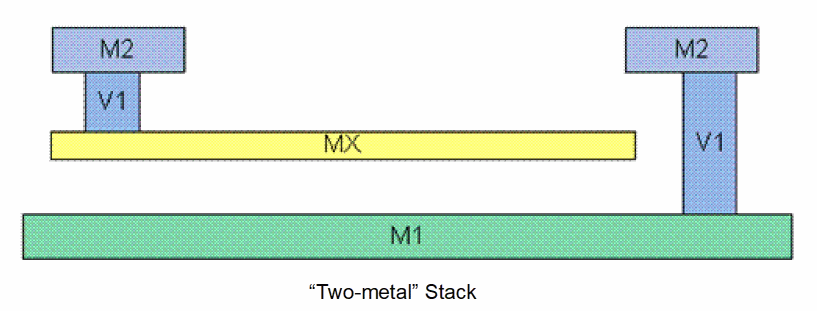 The figure below represents a “two-metal” connectivity stack. Here, the cut layer, V1, connects the metal layer with a higher mask number, M2, to another metal layer, M1, which has a lower mask number. In addition, the cut layer connects the top metal layer to an intermediate metal layer, MX.