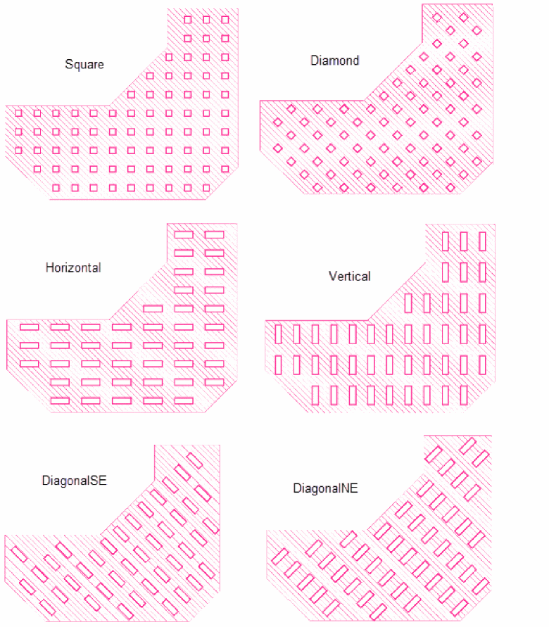 lets you define a slot orientation for the shapes to be slotted. You can select one of the following orientations for the slots: Default, Square, Diamond, Horizontal, Vertical, diagonalNE, and diagonalSE. If the slot orientation is other than default, then the slotting on an object respects the specified orientation and overrides the directional pattern as well as the pattern at turn. The following figure shows the various slot orientation patterns. ![]() Environment variable: slotOrientationMode |