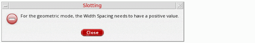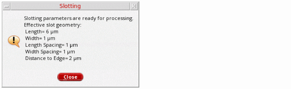 The green status indicates that slotting can be done. When you click the Slotting button with the green status, a Slotting message box appears mentioning the effective slot geometry parameters, as shown below.