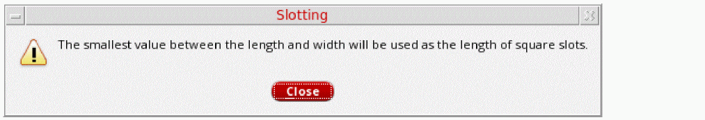 The yellow status indicates that slotting can be done, but there is an undesired parameter, or value of a parameter. When you click the Slotting button with the yellow status, a warning message appears mentioning the undesired parameter, or the value of the parameter, as shown below.
