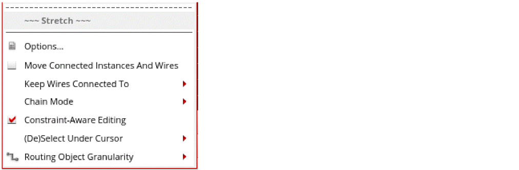 Maintains the connectivity between instances and pathSegs and the selected object while moving or stretching the instances or pathSegs. When this option is selected, the Keep Wires Connected to and Lock Unselected Vias options are disabled.