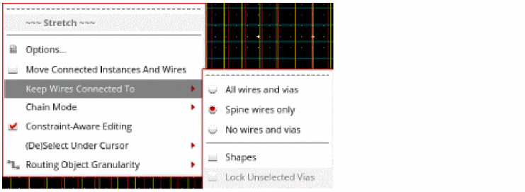 Spine wires only: maintains connections to spine pathSegs but not to connecting vias when stretching a spine. This option is selected by default. For information about selecting a spine, see Selecting a Path Vertex.