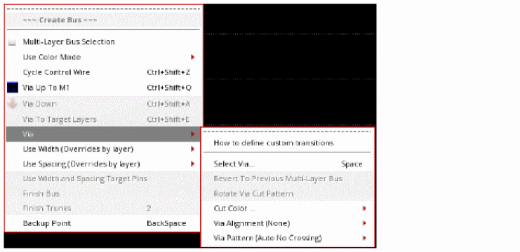When current layer is unable to connect to any lower layer in the layers stack, the Via Up field appears disabled in the Create Bus Context Sensitive menu.