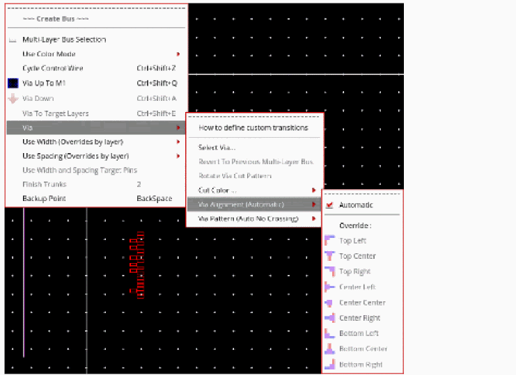 Provides options to align vias while adding them to the layout. You can choose to align a via automatically or by selecting a custom alignment option. You can also align a via by using the Via Alignment options on the Select Via form. The Override options on the Via Alignment shortcut command are available while you are adding a via.