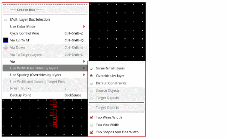 Tap Wires Width: When selected, enables tapping the width on the starting object for new wire when the starting object is a wire. The Tap Wires Width option is disabled when the Auto Tap Wire option is deselected in the Layout Editor Options form. To enable the Tap Wires Width option in the Use Width menu, select the Auto Tap Wire option in the Layout Editor Options form.