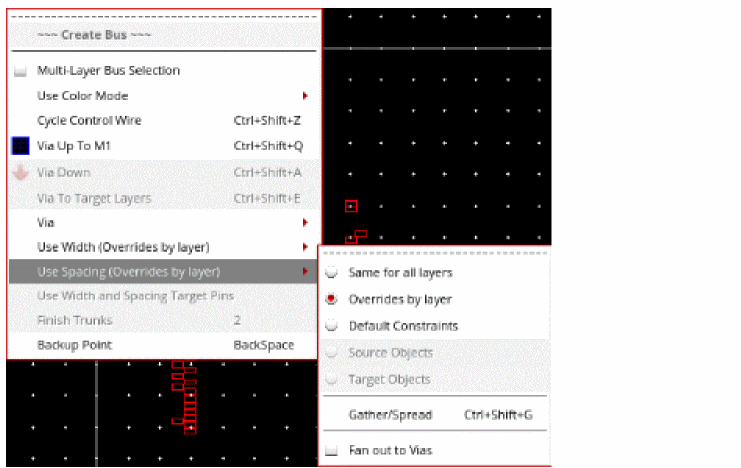 Overrides by layer: Sets the bus wire spacing same as the spacing value from the Wire Assistant table on each layer. By default, the result of the constraint lookup for