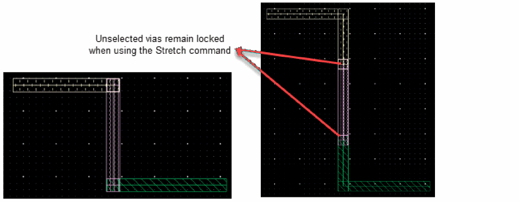 The following figure shows the behavior of how the wire is stretched when the unselected vias are locked.