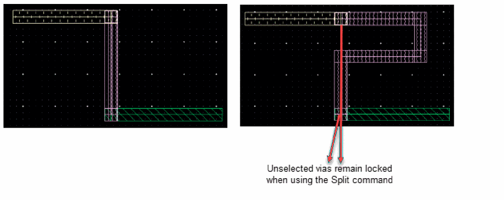 Similarly, the following figure shows the behavior of how the wire is split when the unselected vias are locked.