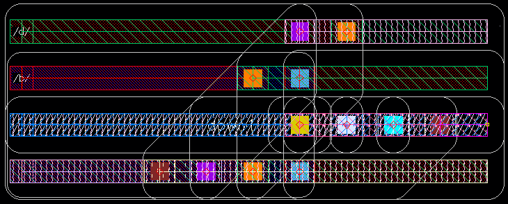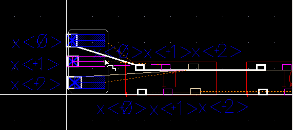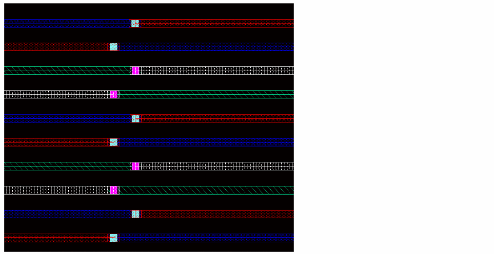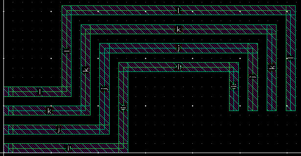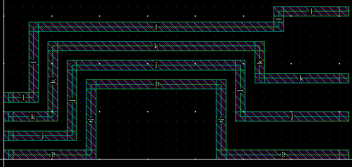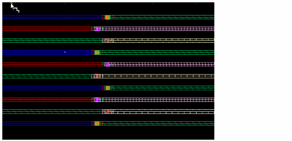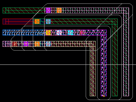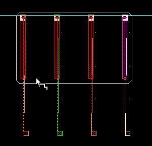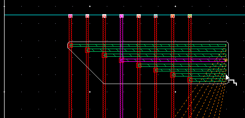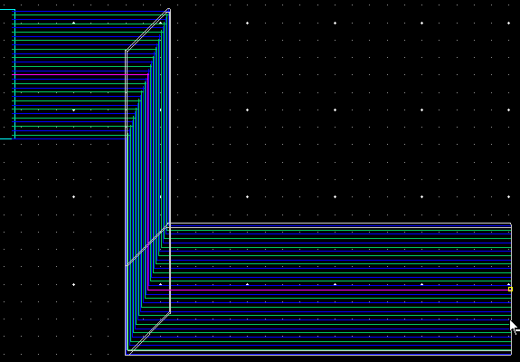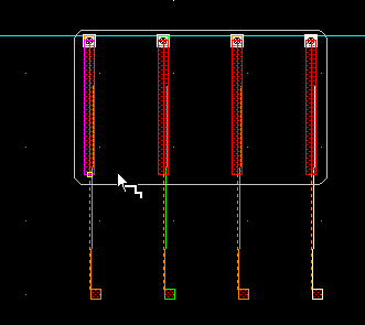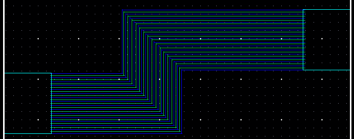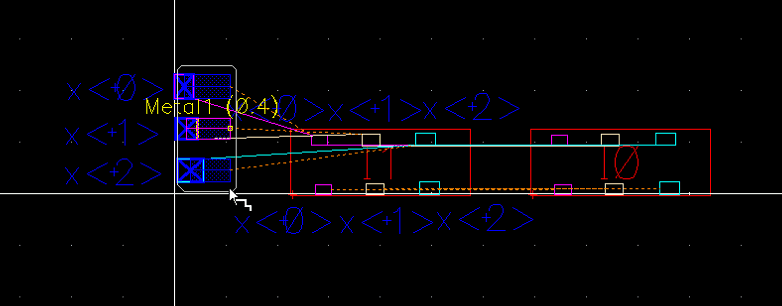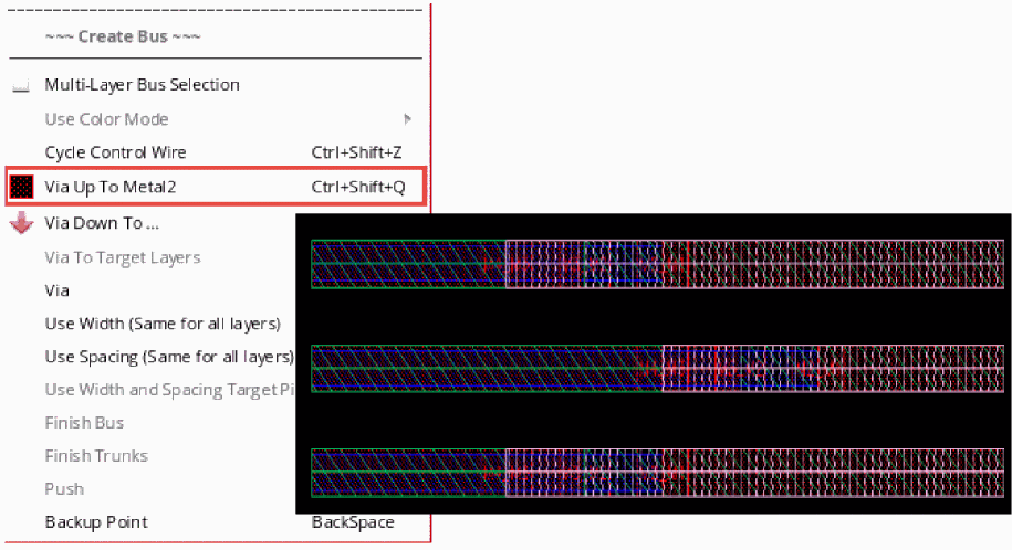 Right-click the wire stack being created and select Via Up To <layer name> or Via Down To <layer name> to move the wire stack up or down a layer, respectively. The following figures shows an example where vias are inserted for each wire stack and the wire stacks on different metal layers move up a higher metal layer when Via Up To <layer name> is selected. After inserting a via, the multi-layer bus continues in the straight direction.