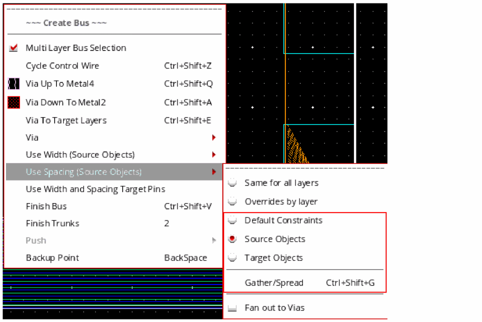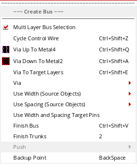 For creating a bus, ensure that the technology file contains the minimum information, such as complete foundry rules, and that the non-default or override constraint groups, if any, are specified in the virtuosoDefaultSetup or LEFDefaultRouteSpec) that defines the valid layers and the vias allowed for routing must be present in the technology file.