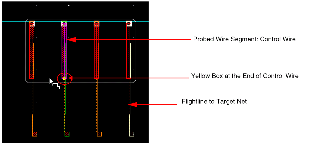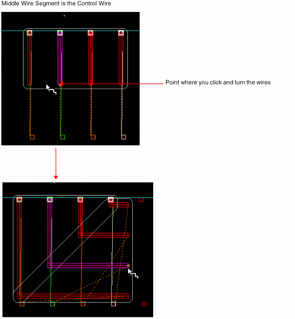 Right-click the wire stack being created and select Via To Target Layer to move the wire stack to the layer of the target wire stack. The following figures shows an example where the wire stack on