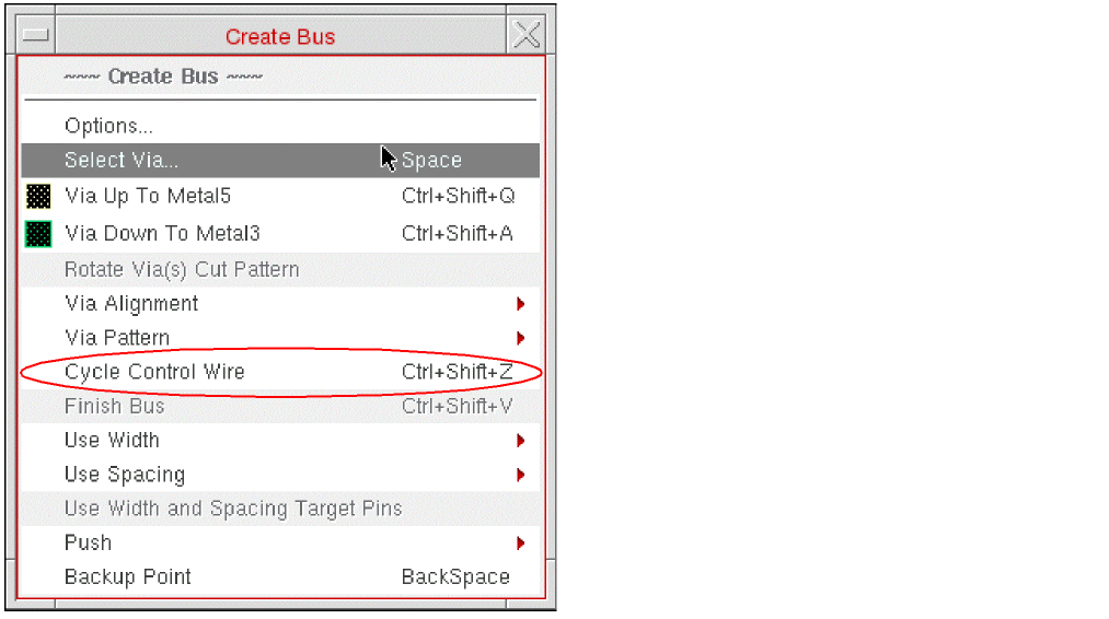 If required, choose Use Width from the context-sensitive menu to switch the control wire function to one of the extreme wires or the center wire of the bus. For information about control wires, see Using the Control Wire. -