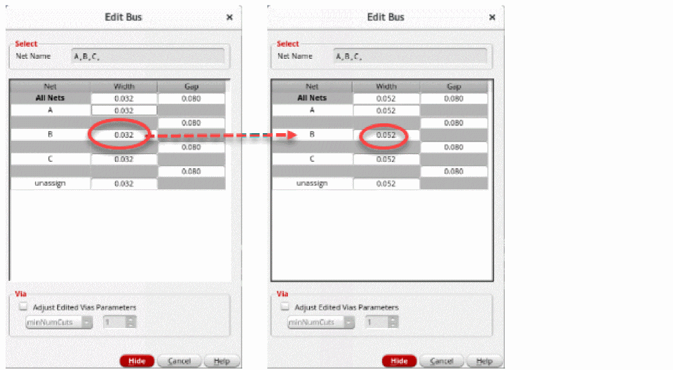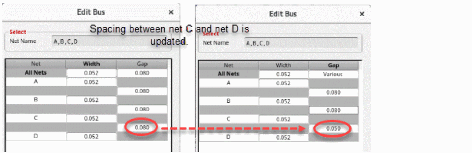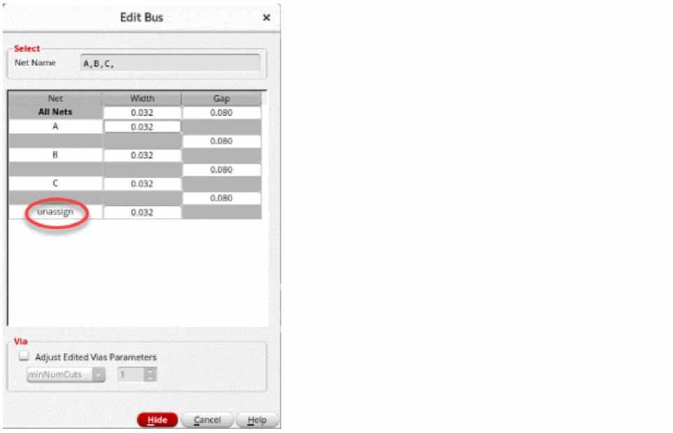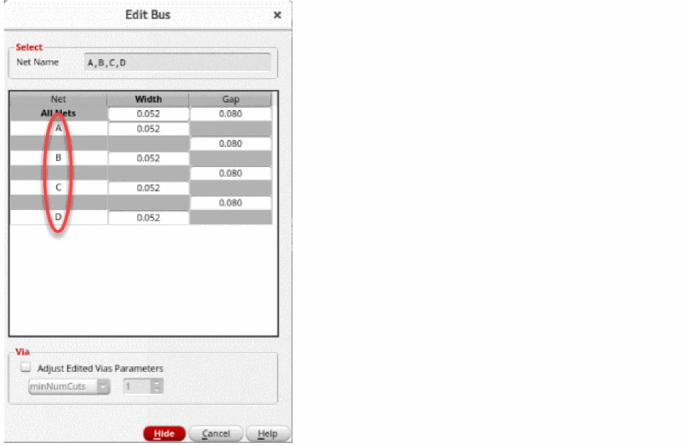 If the nets specified in the Net Name field do not exist in the design, the nets are created. Using this method, you can create floating buses. - Select the Create Bus Constraint check box if you want a bus constraint to be created automatically for the picked or the specified nets.