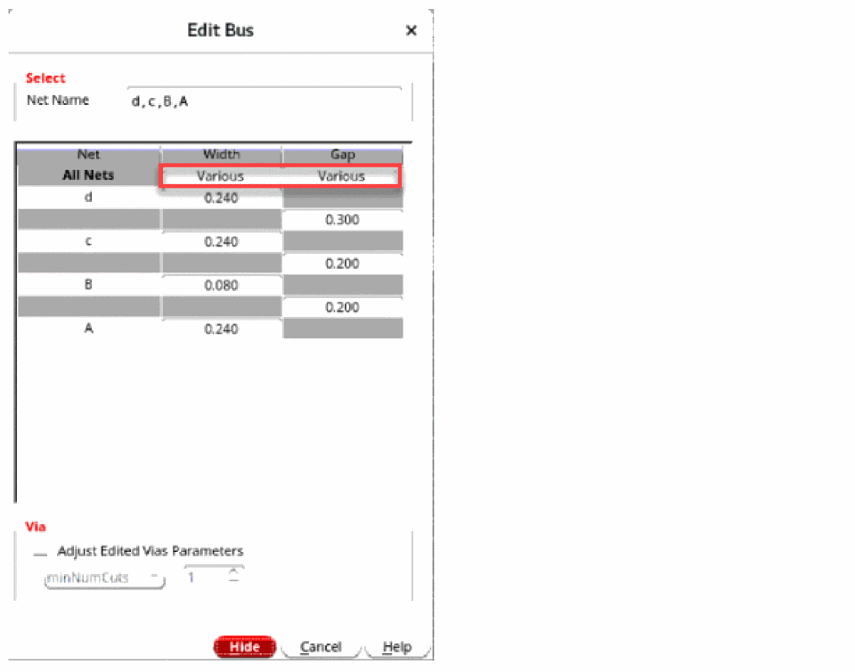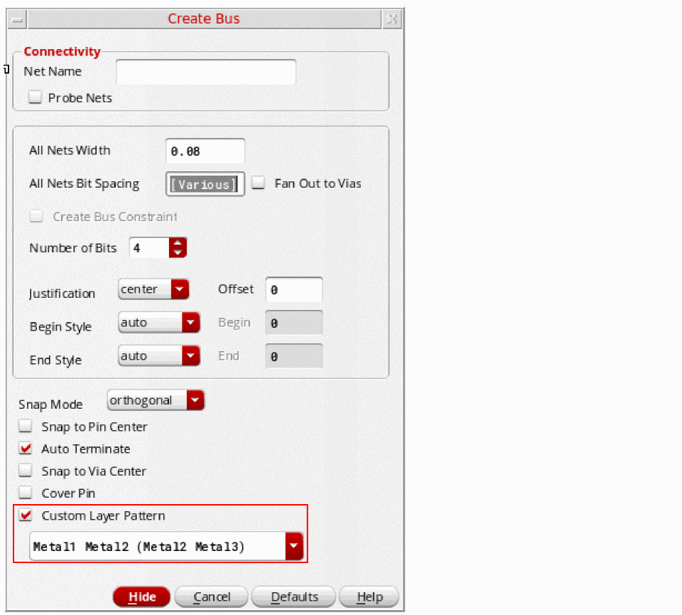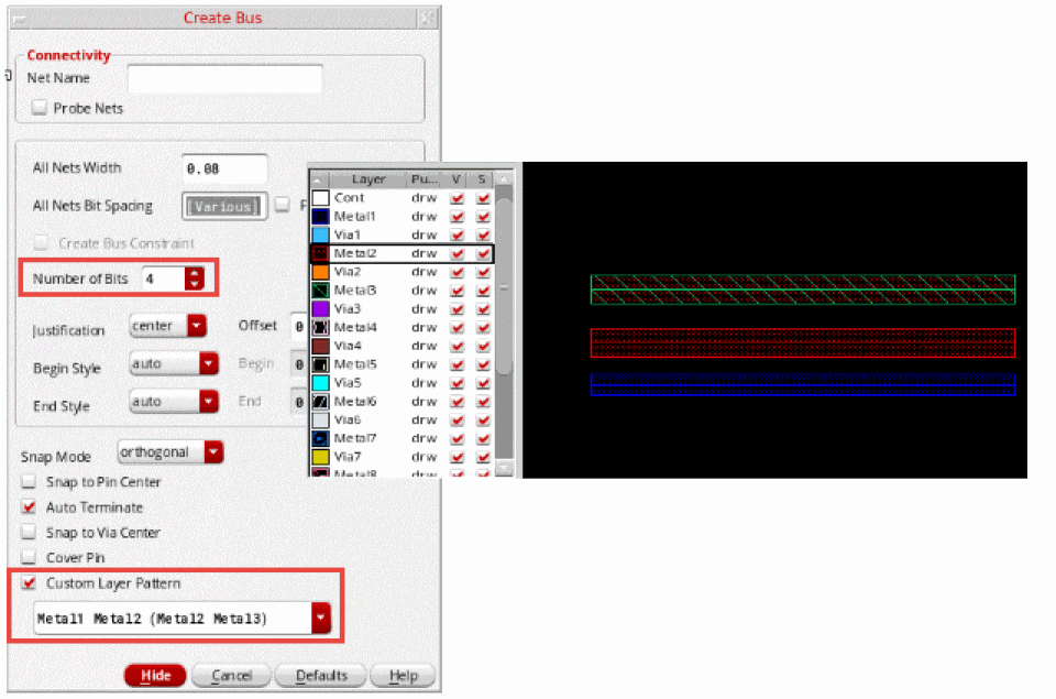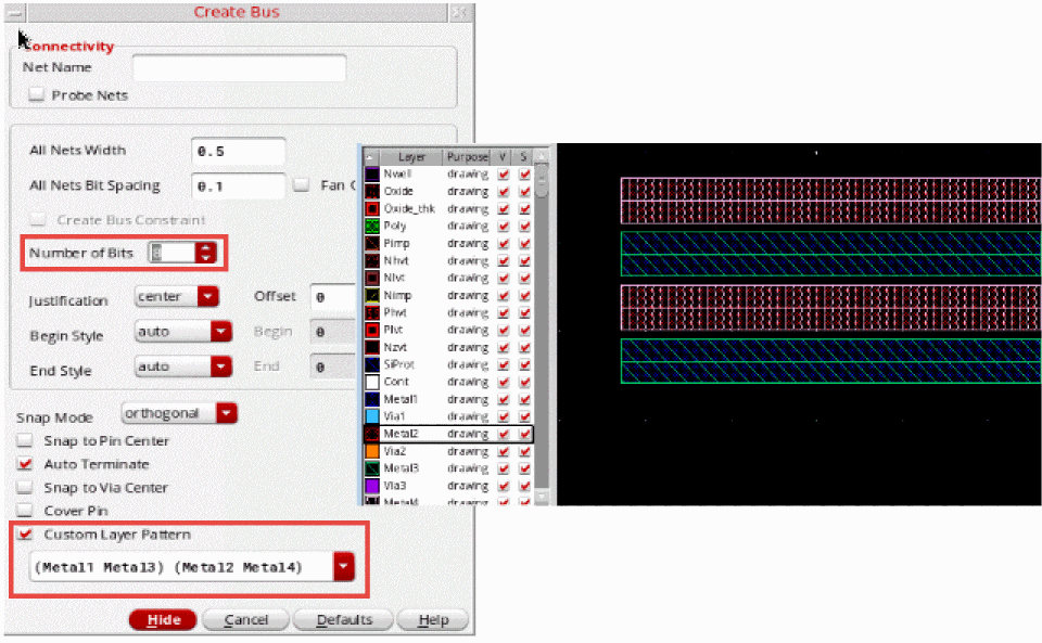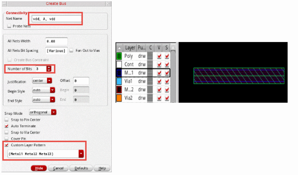 You can create a bus in the Virtuoso Layout Suite by using the Create – Wiring – Bus command. All wires of the bus, referred to as bus bits, are created on the same layer. When you change the bus layer, all bus bits change to the same layer. A bus now supports a mixture of assigned and unassigned nets, as well as repeated nets. Consider an example, where a bus has five bits bus such as: