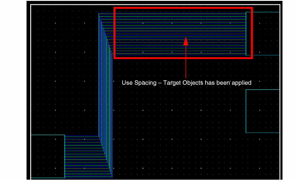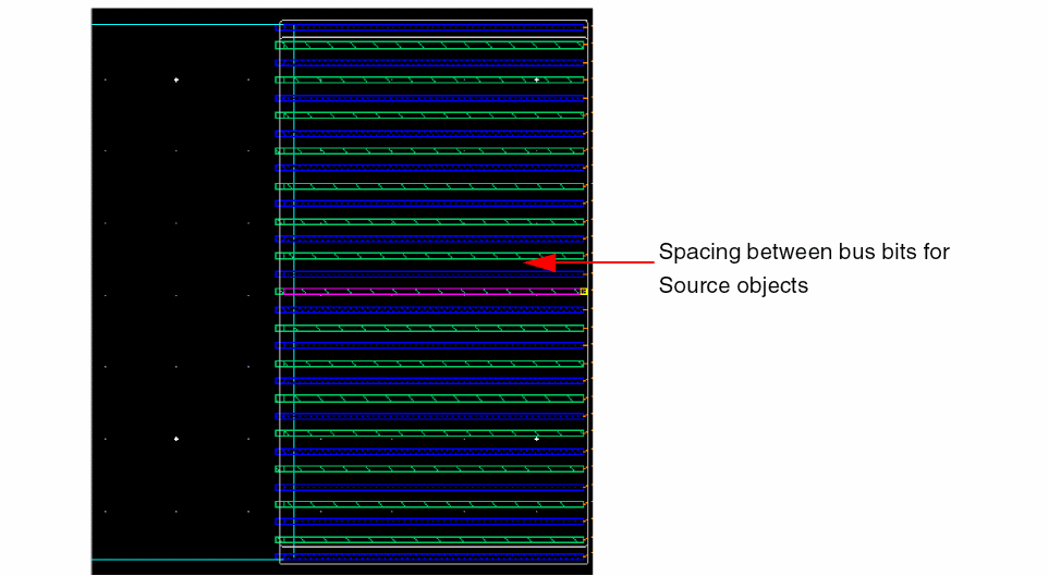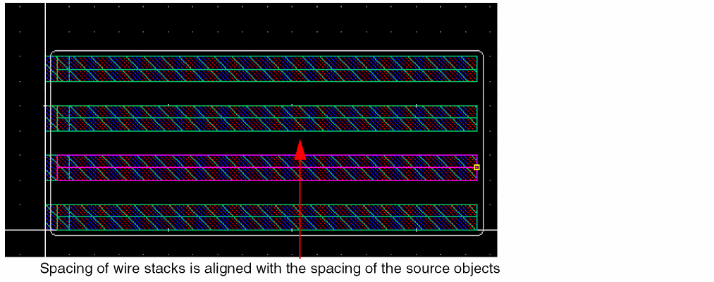 The spacing between the wire stacks is based on the Source Objects, Default Constraints, Gather/Spread, and Overrides by layer options. These options are available in the Use Spacing submenu. By default, the spacing between the wire stacks is adjusted to align with the spacing of the source objects, as shown in the following figure.