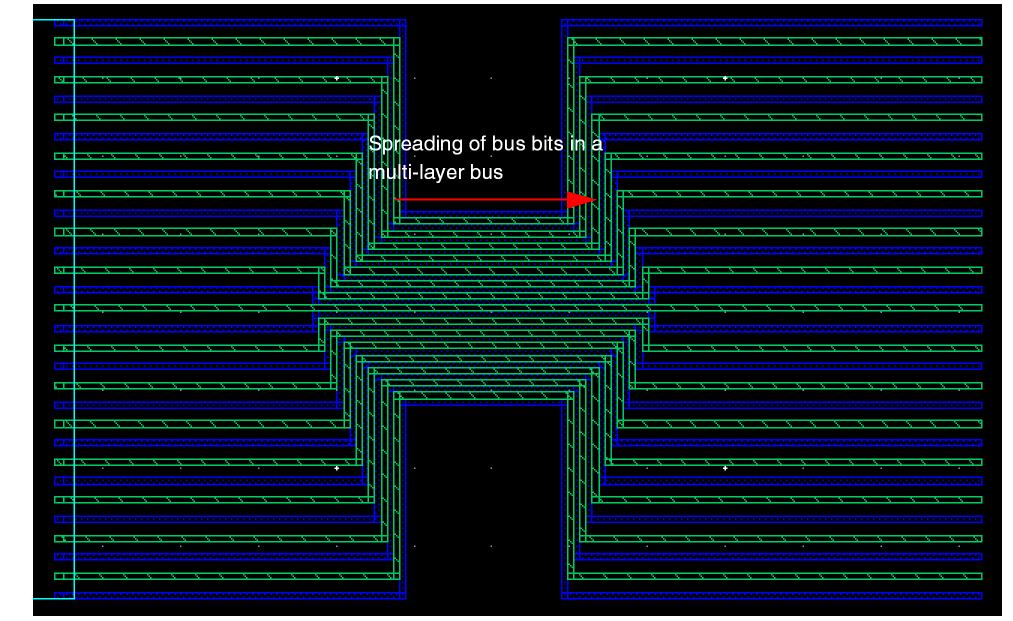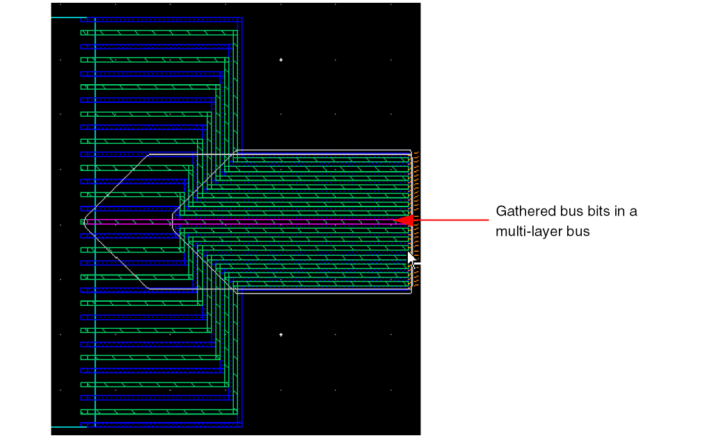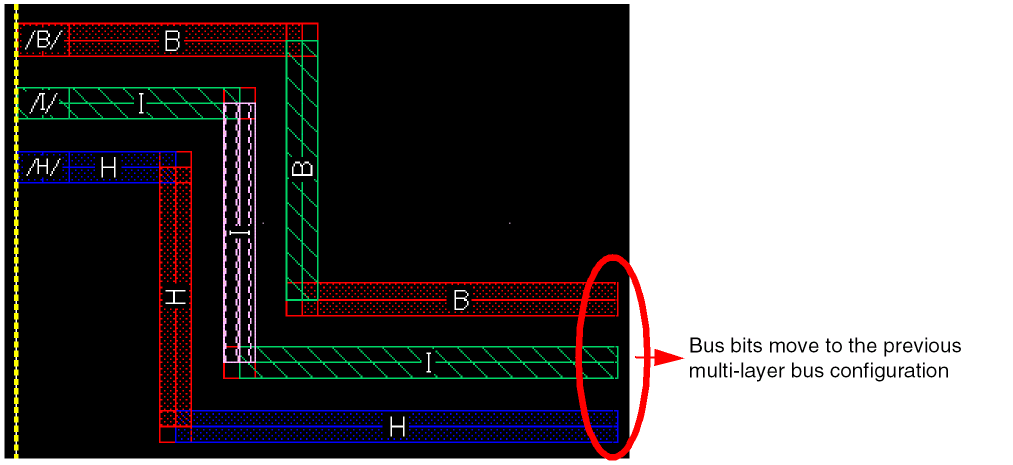 In case of a wire stack on the same layer, you can revert to the previously used multi-layer bus configuration. When you revert to the previously used multi-layer configuration, same spacing between the wire stacks is retained and you continue with the bus bits that are spread. If you now make a bend and click and continue to create a multi-layer bus, the bus bits are gathered and you move back to the multi-layer wire stack configuration.