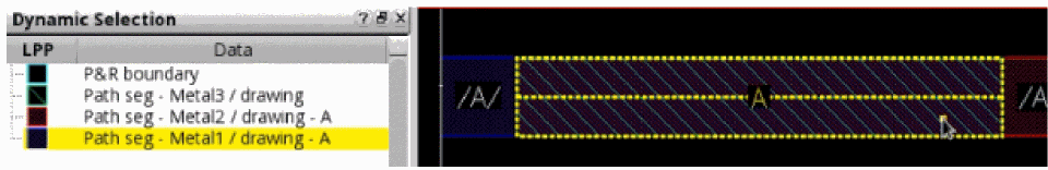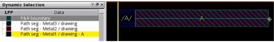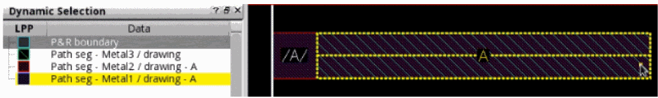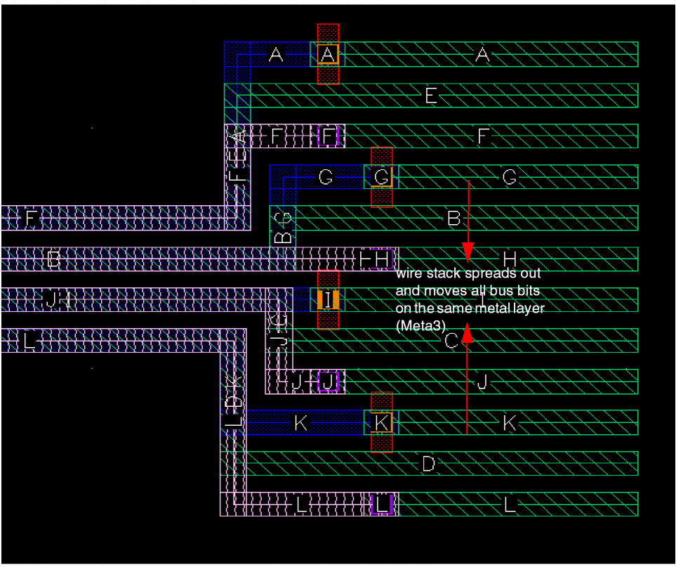 In the form, select the metal layer to which you want to move the wire stack. When moving to the same layer, the bus bits in the wire stack are spread, such that there are no spacing violations. In the following figure, all the bus bits are moved to