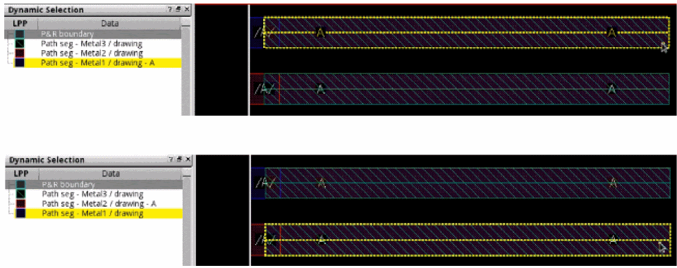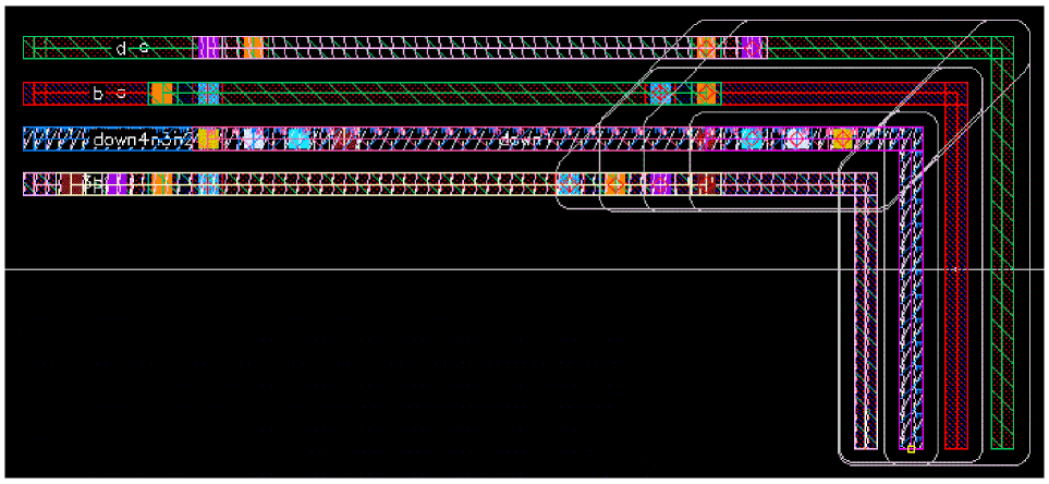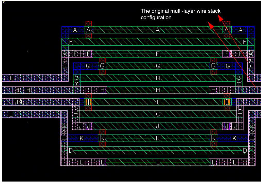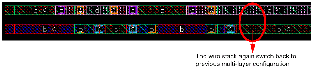 Similarly, in the following figure, you can see an example in which the wire stacks on higher metal layers move down a metal layer when Via Down To <layer name> is selected.