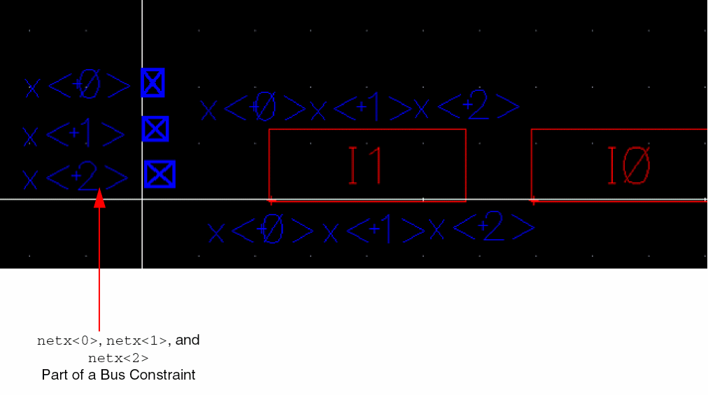 If you start the Create Bus command and click a single pin that belongs to a bus constraint, the command automatically enables bus mode. In the example below, a bus constraint is defined on netx<0>, netx<1>, and netx<2>.
