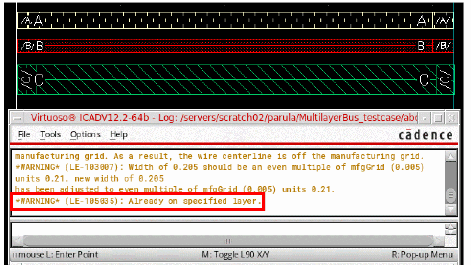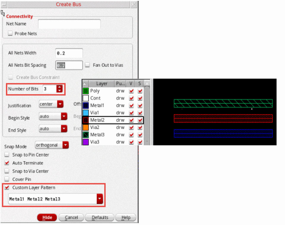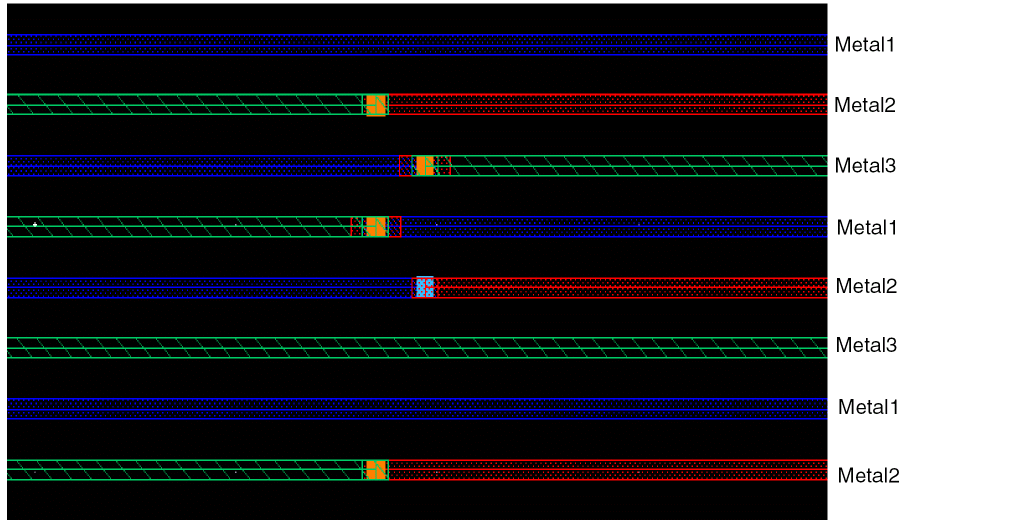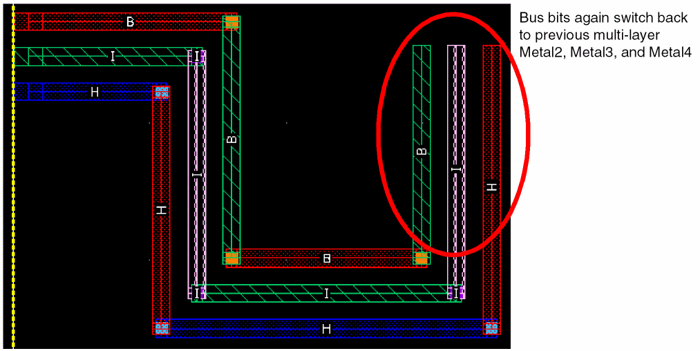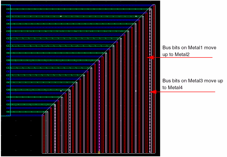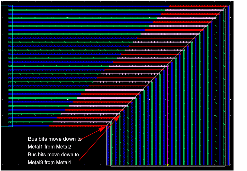 When this SKILL procedure is run, bus bits switch to Metal1, Metal2, and Metal3, irrespective of the input metal layer of the bus bit. This alternate transition of bus bits applies to the complete bus whatever is its size.