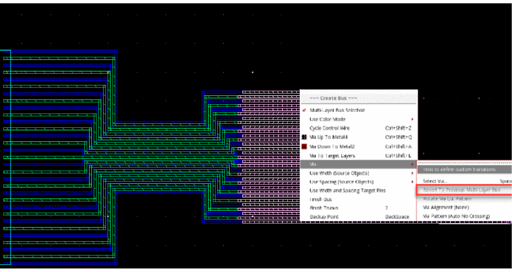 When you start creating a bus from stacked pins, and then select Via Up To <layer name>, vias are inserted for each wire stack and the wire stack moves up to a higher metal layer. If you now select the Revert To Previous Multi-Layer Bus option from the Via submenu, vias are inserted again and the bus bits switch back to the previous multi-layer configuration of the wire stack, as shown in the following figure.