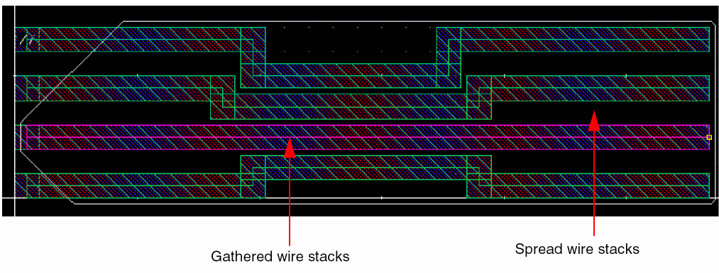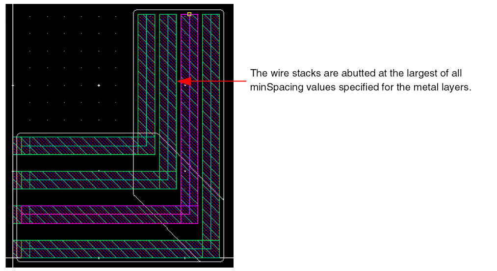 You can adjust the spacing between the wire stacks by selecting the other options available on the Use Spacing submenu. For example, when you select the Default Constraints option, the wire stacks are abutted based on minSpacing. The spacing between the wire stacks is set to the largest of all minSpacing values specified for the metal layers involved in the wire stack, as shown in the following figure.