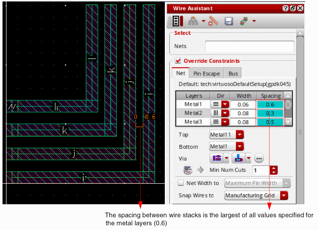 The spacing between the wire stacks can also be specified by using the Overrides by layer option in the Use Spacing submenu. When the Overrides by layer option is selected, the spacing between the wire stacks is set to the largest of all spacing values specified for the metal layers in the width and spacing table on the Net tab in the Wire Assistant, as shown in the following figure.