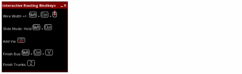 When you start the Create Bus command in Layout EXL, the Interactive Routing Bindkeys hint box is displayed at the top-left corner of the layout canvas. The hint box describes the most useful bindkeys and shortcuts for the Create Bus command.
