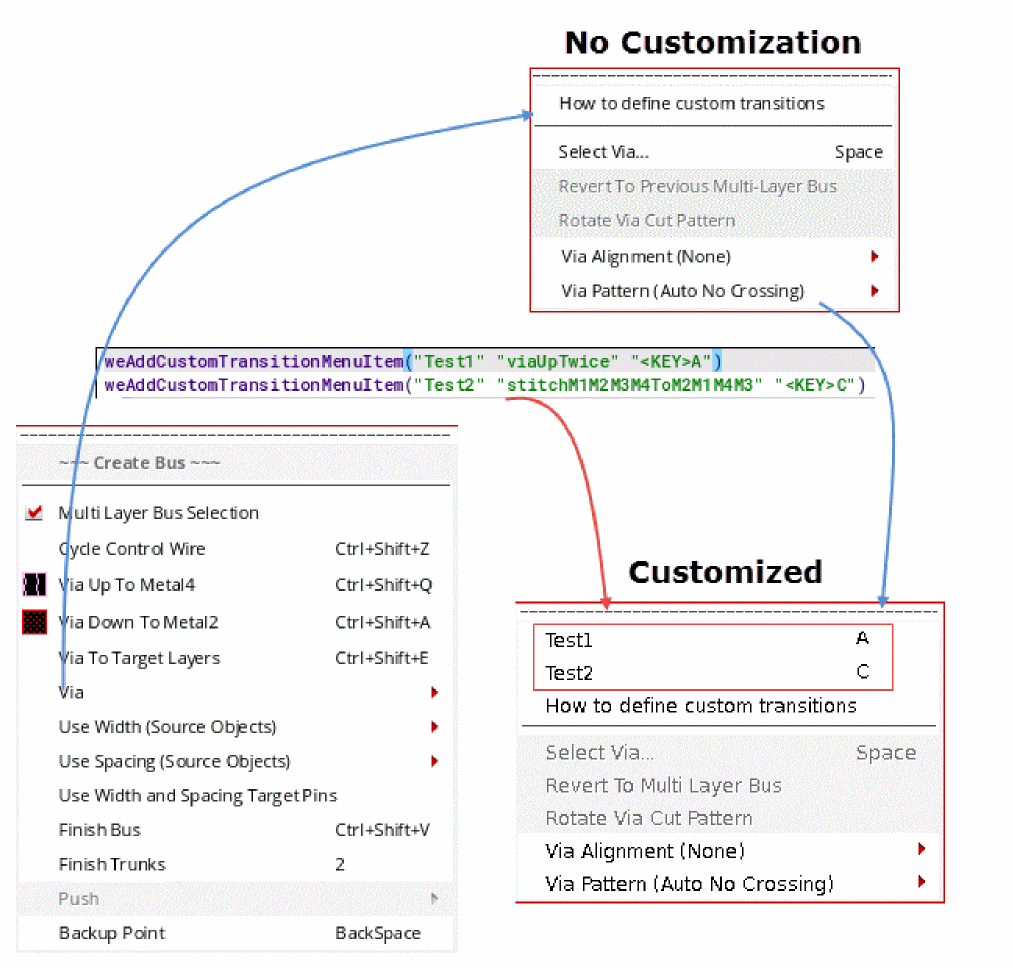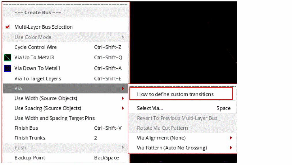 The How to define custom transitions options available on the Via submenu provides information about how you can customize the multi-layer bus functionality.