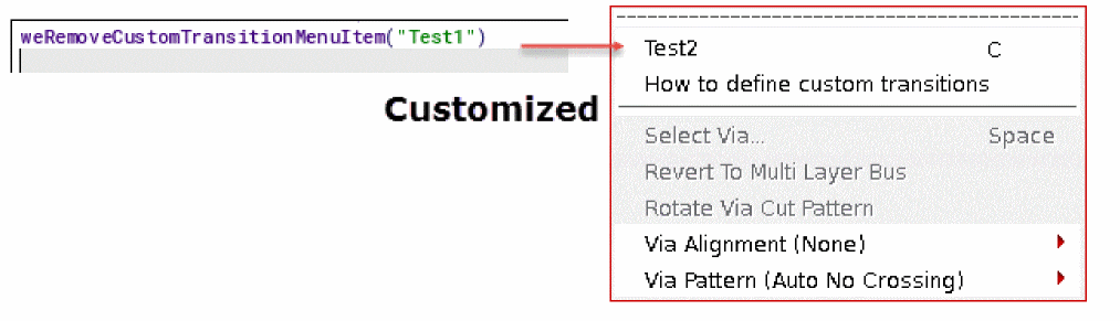 To remove an option from the Via submenu, use the weRemoveCustomTransitionMenuItem SKILL API. The following figure shows the customized menu after an existing option is removed.