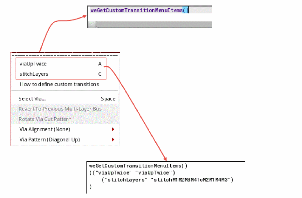 To add the SKILL procedure as an option on the Via submenu, use the weAddCustomTransitionMenuItem SKILL API. You can add multiple procedures to the Via submenu, which are placed one below the other, as shown in the following figure.