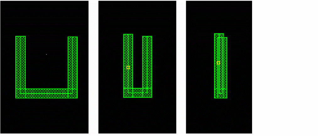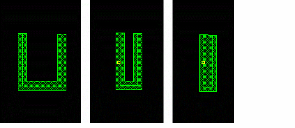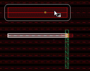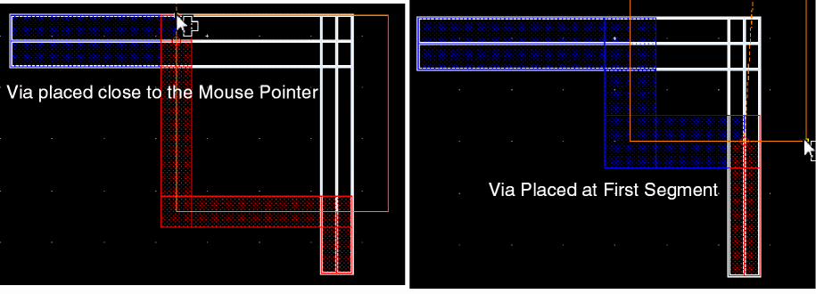 In addition, while reshaping a wire in a rectangle mode, if the two intersection points of selected wires are on different layers then reshape command will keep the connectivity by repositioning the vias in between them. The vias of the reshaped wire are either placed close to the mouse pointer or at the first segment as shown in the following figure.