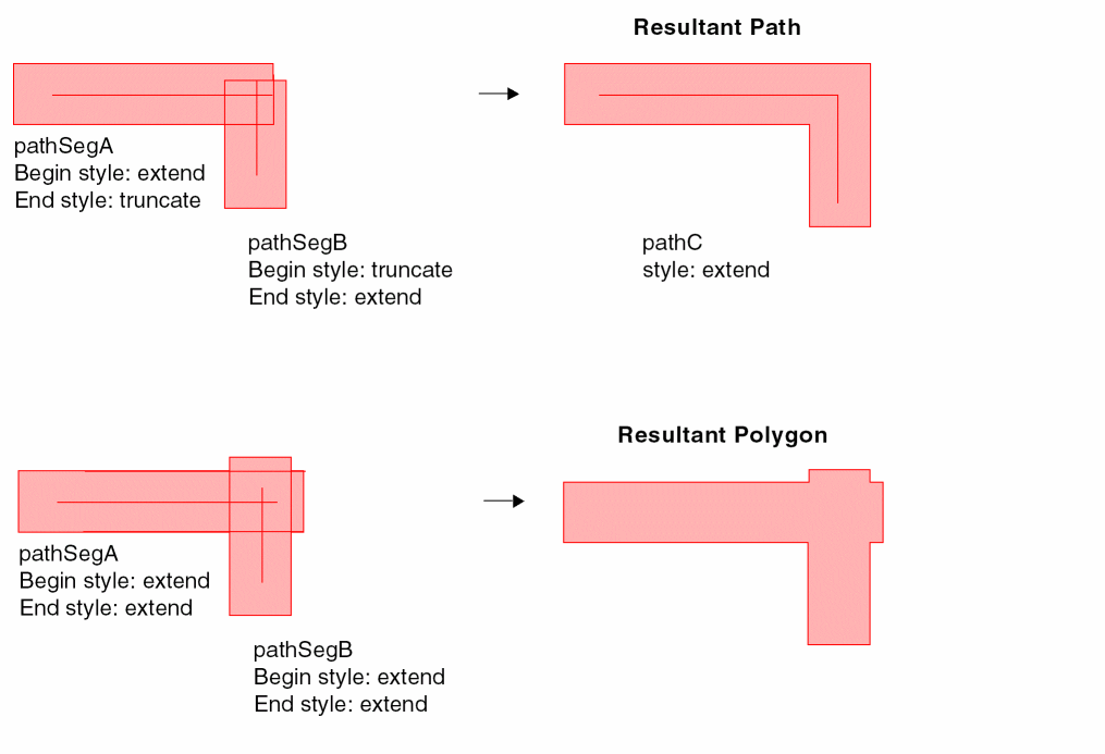 The following table lists the combinations of end styles possible by merging pathSegs that abut or overlap at an angle. Also stated is the situations in which merging the pathSegs results in a polygon.