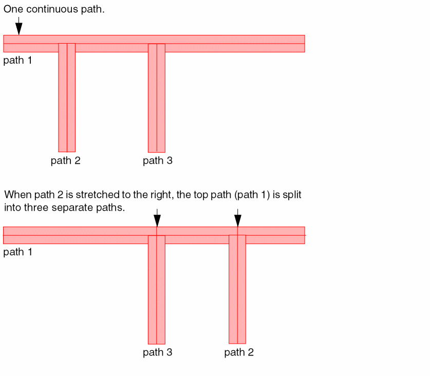 When wires are created using paths, the stretch command will preserve the path objects and not split the paths into separate paths when ever possible. However, there are cases when it is necessary to split path objects. The following examples show situations where paths will be split due to stretching of the paths.