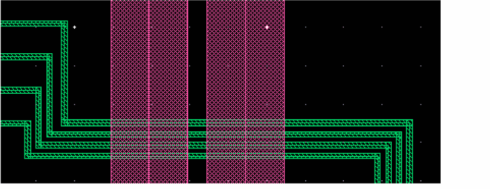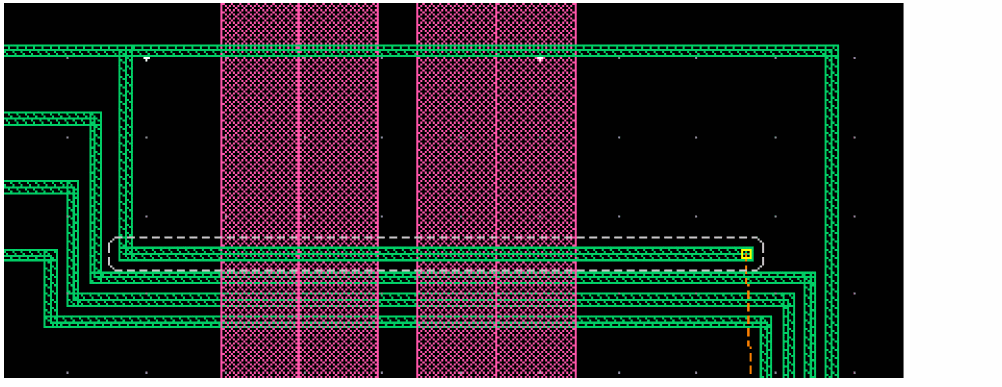 When you stretch a wire across tracks, the width of the wire is adjusted to the width of the track pattern to which it is stretched. For example, the global region has stdCell pattern, which has different width on different tracks. The figure below shows that when a wire is stretched, the width of the wire is adjusted to the width of the track pattern to which it is stretched.
