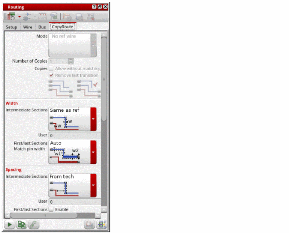 The Copy Route command lets you work incrementally and generate thousands of bus wires. When there are pins or instance pins for the copies, the width and the spacing of the copy route is based on them. Otherwise, you can control the width and spacing settings for the intermediate transitions from the form.