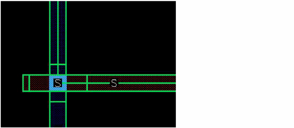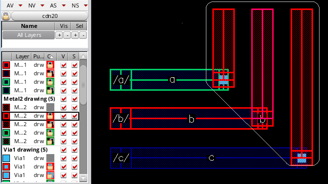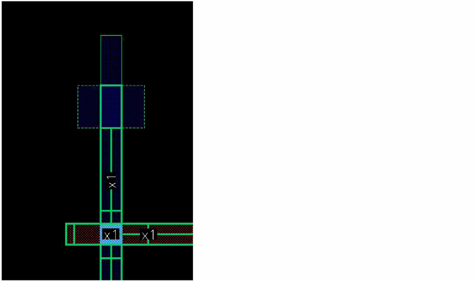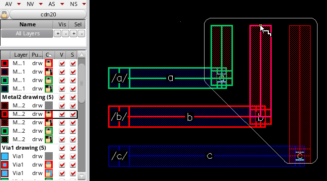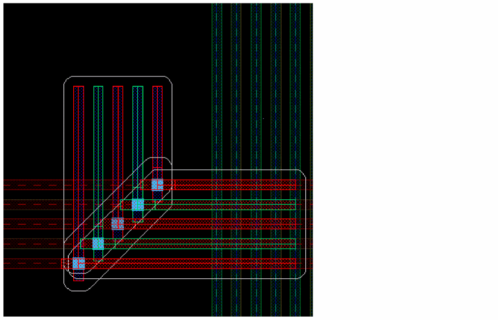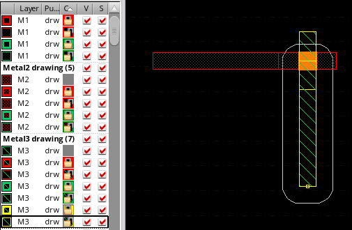 You can also change the mask color of the control wire and the other bus bits after placing the via by resetting another layer-purpose pair as active in the Palette. The following figure shows how the mask color of the control wire and the via placed on it is updated when you change the active layer-purpose pair to