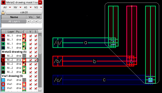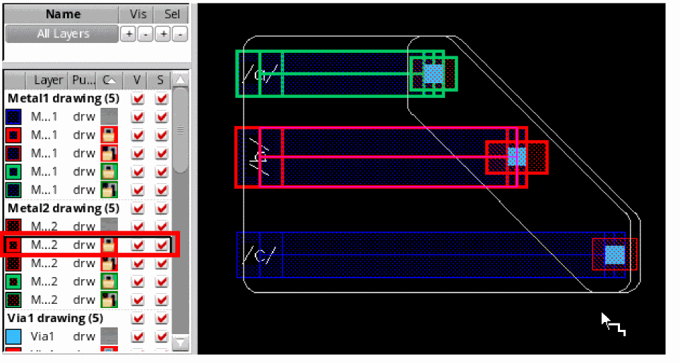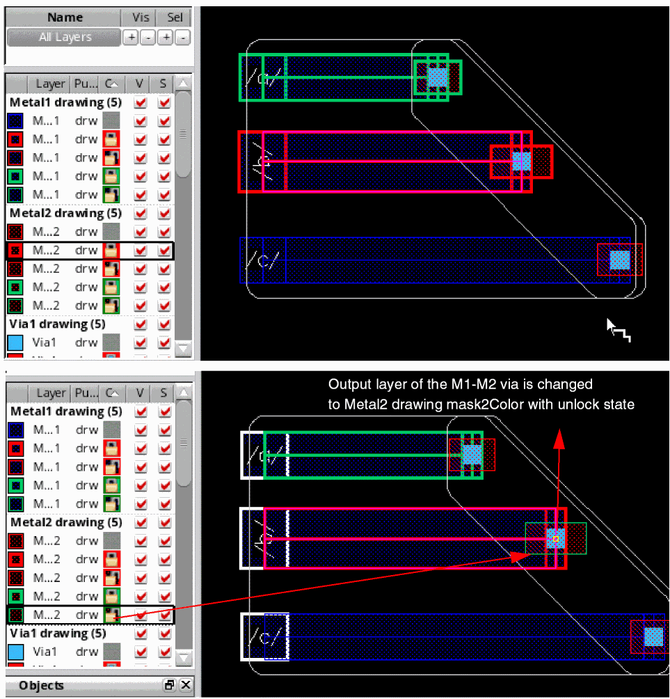 If you change the mask color of the bus bits before placing a via, the color and lock information of the output layer of the via enclosure is accordingly updated. The following figures show that when you selectMetal2 drawing mask2Coloras the active layer from the Palette, the output layer of the via on the control wire is automatically reset tomask2Color. It also shows a change in the via color and lock state frommask1Color,locktomask2Color,unlock.