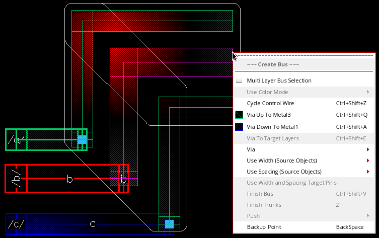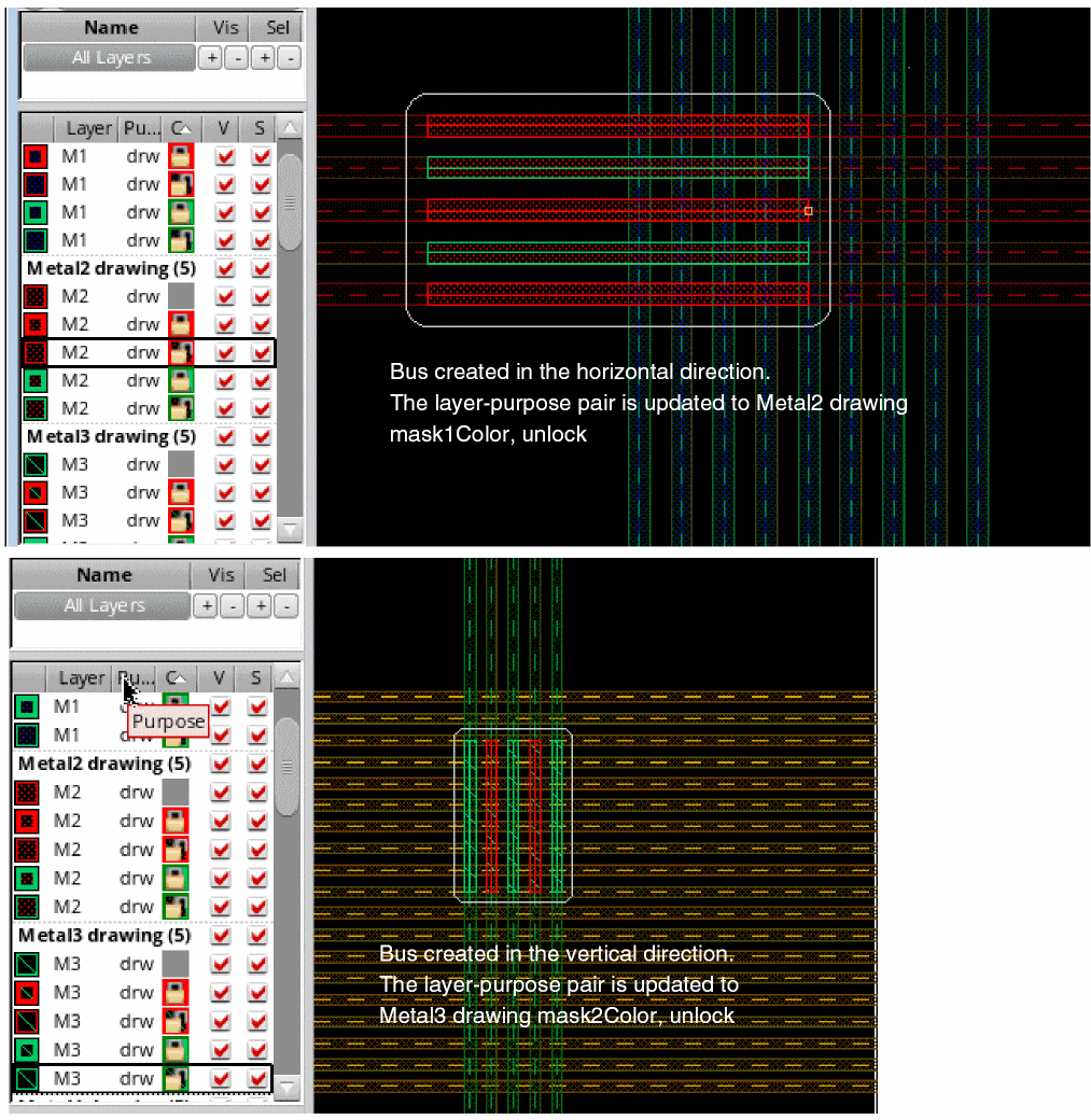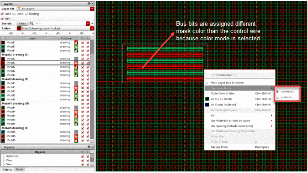 While creating a bus, you can apply a different mask color to the control wire, which, in turn, resets the color of the remaining bits in the bus. You can do this by resetting the active layer-purpose pair in the Palette to a different mask color, which resets the color and lock information of the control wire and also of the remaining bus bits. You can also reapply the color mode, if required.