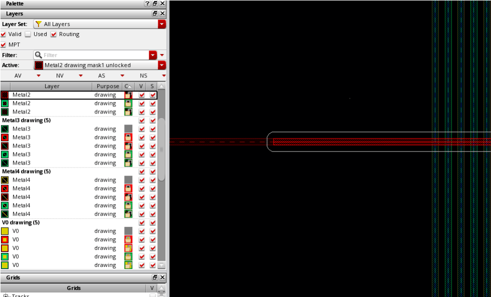 By default, the via and the via top and bottom shapes inherit the color and lock information from the control wire of the bus being drawn. The active layer in the Palette is reset toMetal2 drawing,lockwhich is the output layer of the via that is inserted on the control wire, as shown in the following figure.