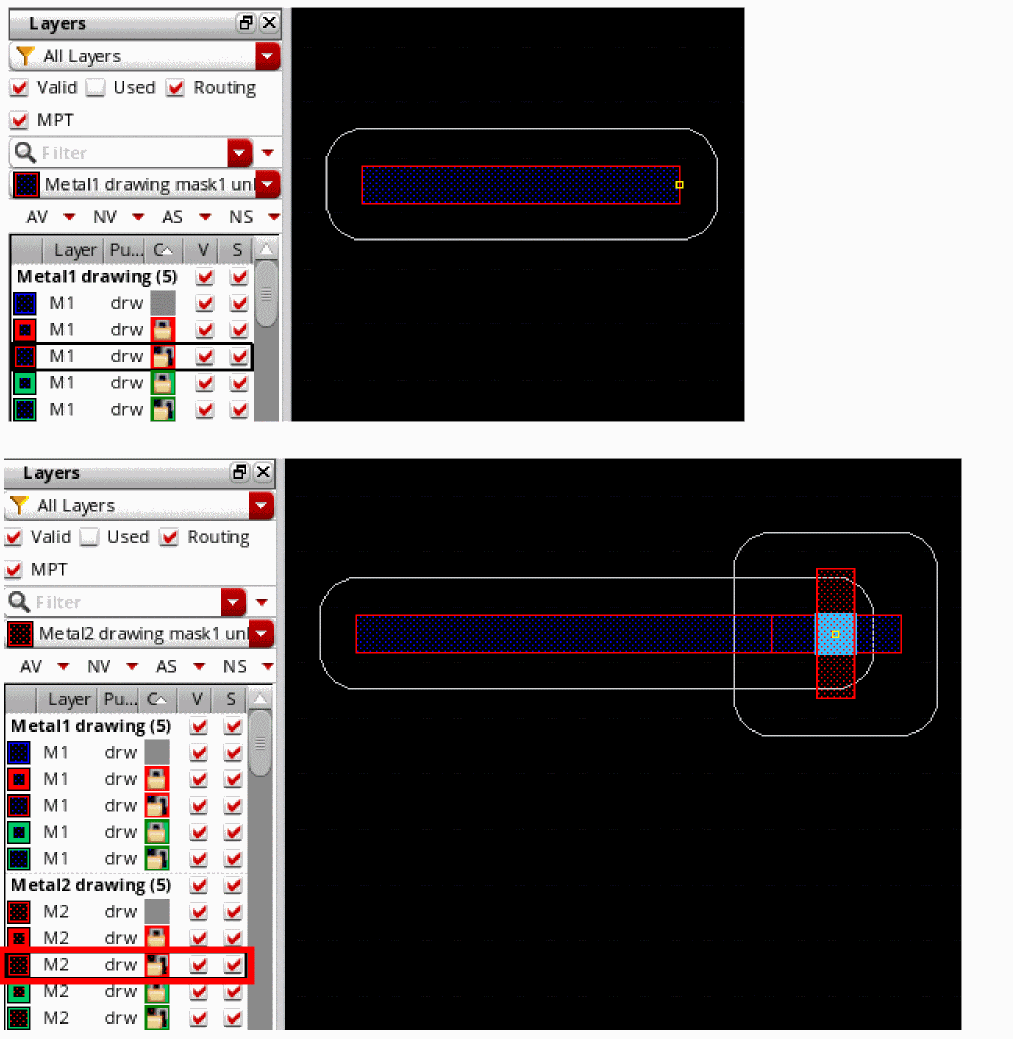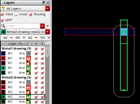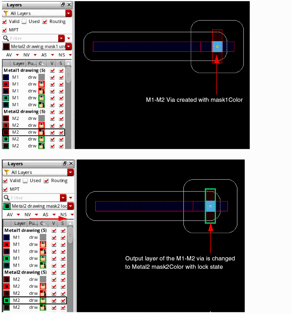 By using the Palette MPT options, you can change the color and lock status of a via before you place it. This changes the color and lock information of the output layer of the via enclosure. The following figures show that the active layer in the Palette is reset to Metal2 drawing, which is the output layer of the inserting via. It also shows a change in the via color and lock state from mask1Color unlock to mask2Color lock.