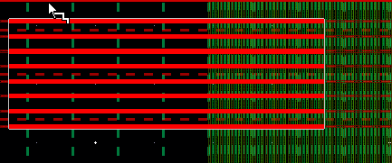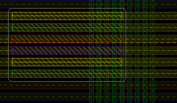 When uniform is selected, all bus bits are assigned the same mask color as that of the control wire. The mask color assigned to the control wire and other bus bits is the same as the active layer in the Palette. The spacing between two adjacent bus bits on the same mask is determined by minSpacing(sameMask). The following figure shows the bus bits in the uniform color mode.