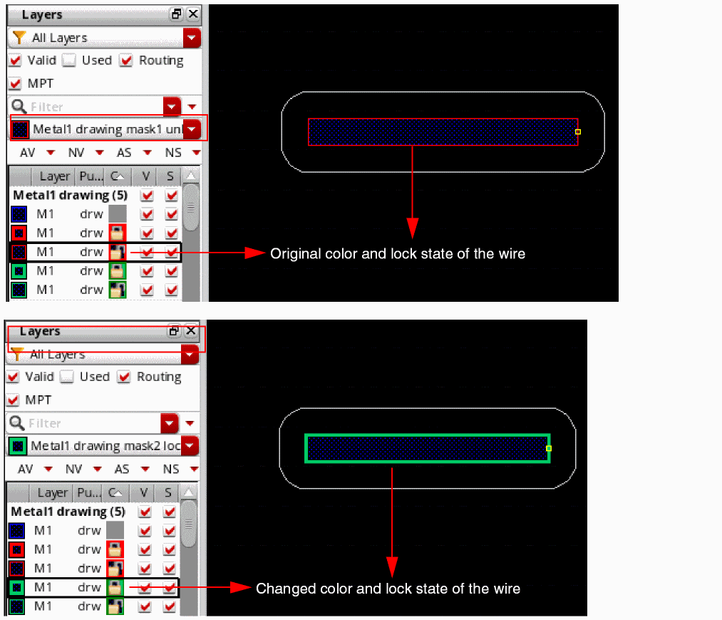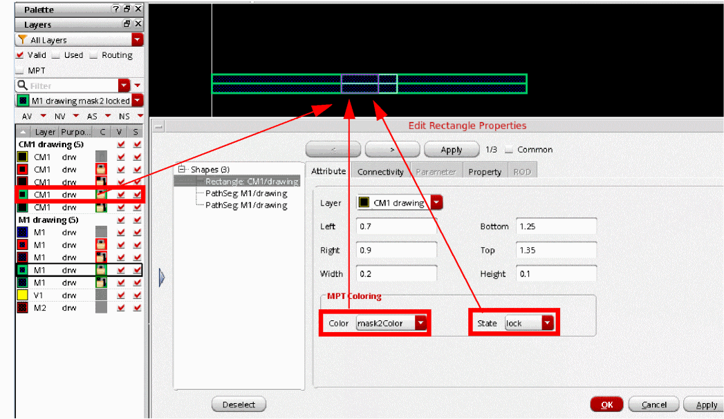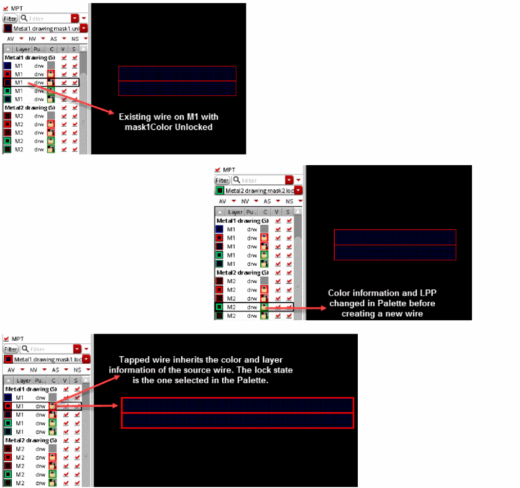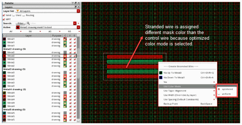 Interactive wire editing supports Palette MPT (Multi-Patterning Technology) feature and lets you create wires with layer, color, and lock state information.
