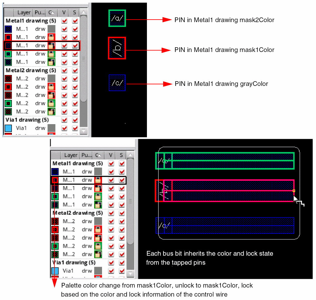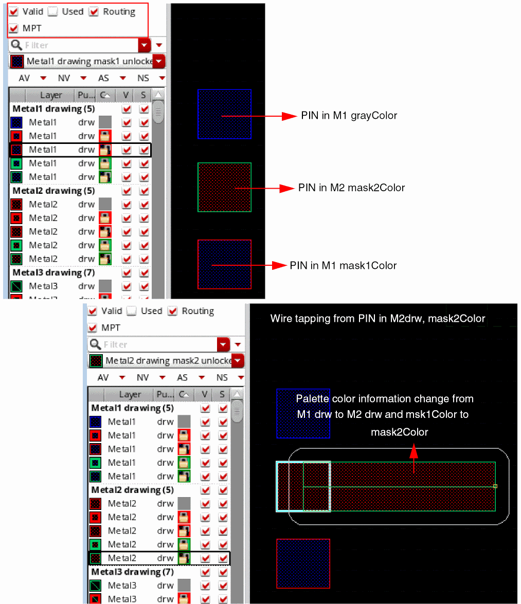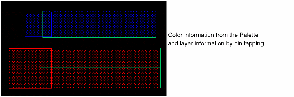 If you now create a wire from a pin on M1 drw with mask1Color, the wire automatically inherits the layer and color information from the pin and the color information in the Palette changes, as shown in the following figure.