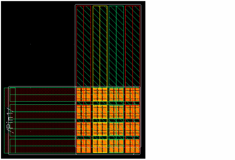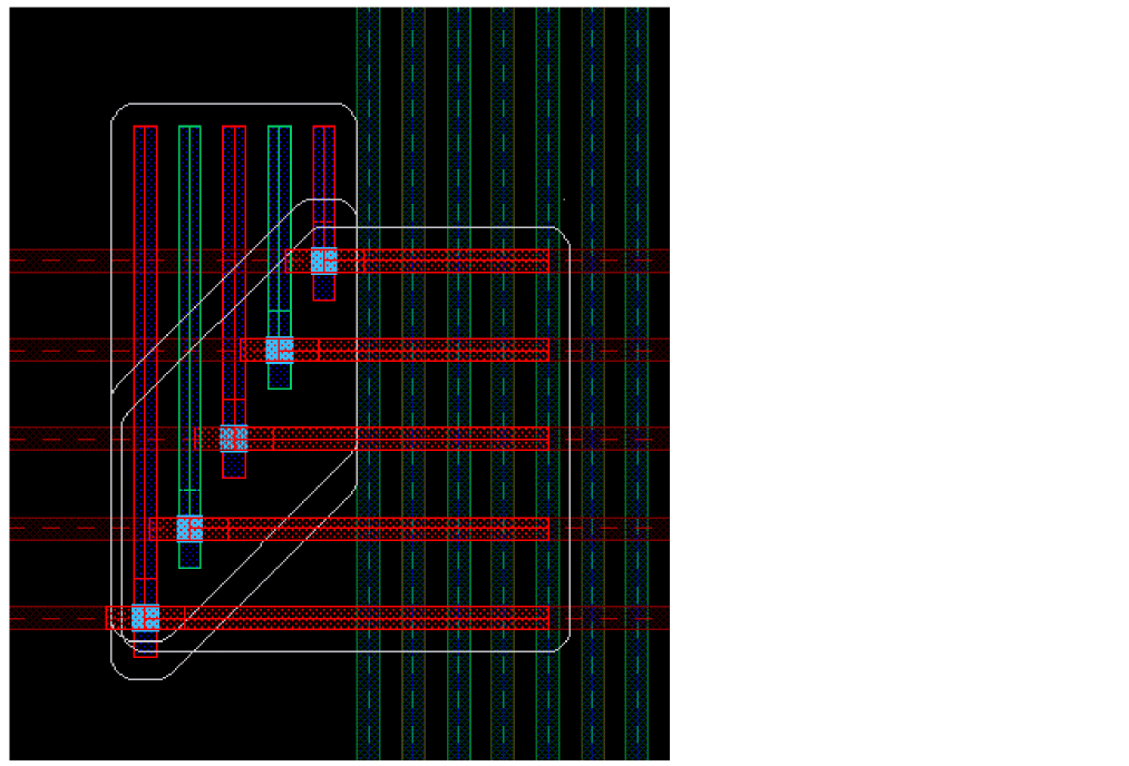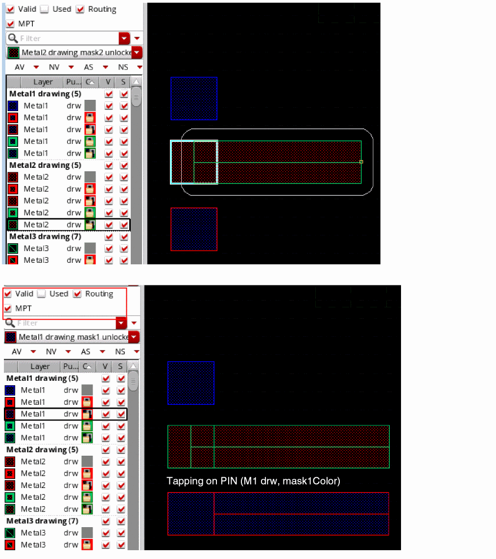 For example, CM1 layer with mask1 color cuts Metal1 with mask1color. Similarly, CM1 layer with mask2 color cuts Metal1 with mask2 color, as shown in the following figures.